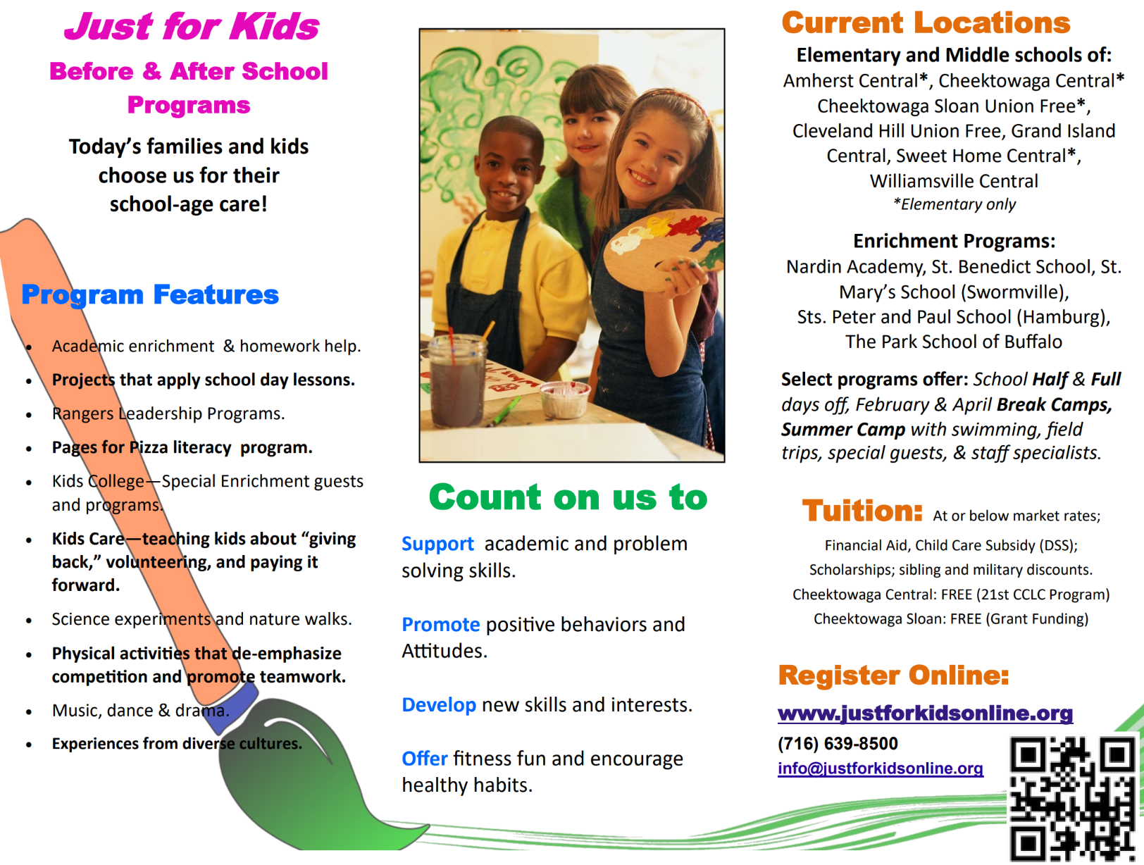 When school's out, Just for Kids is in! Select programs offer full- and half-day programs on school-year days off—including early dismissals and full-day closures—as well as Break Camps in February and April, and Summer Club during summer break.