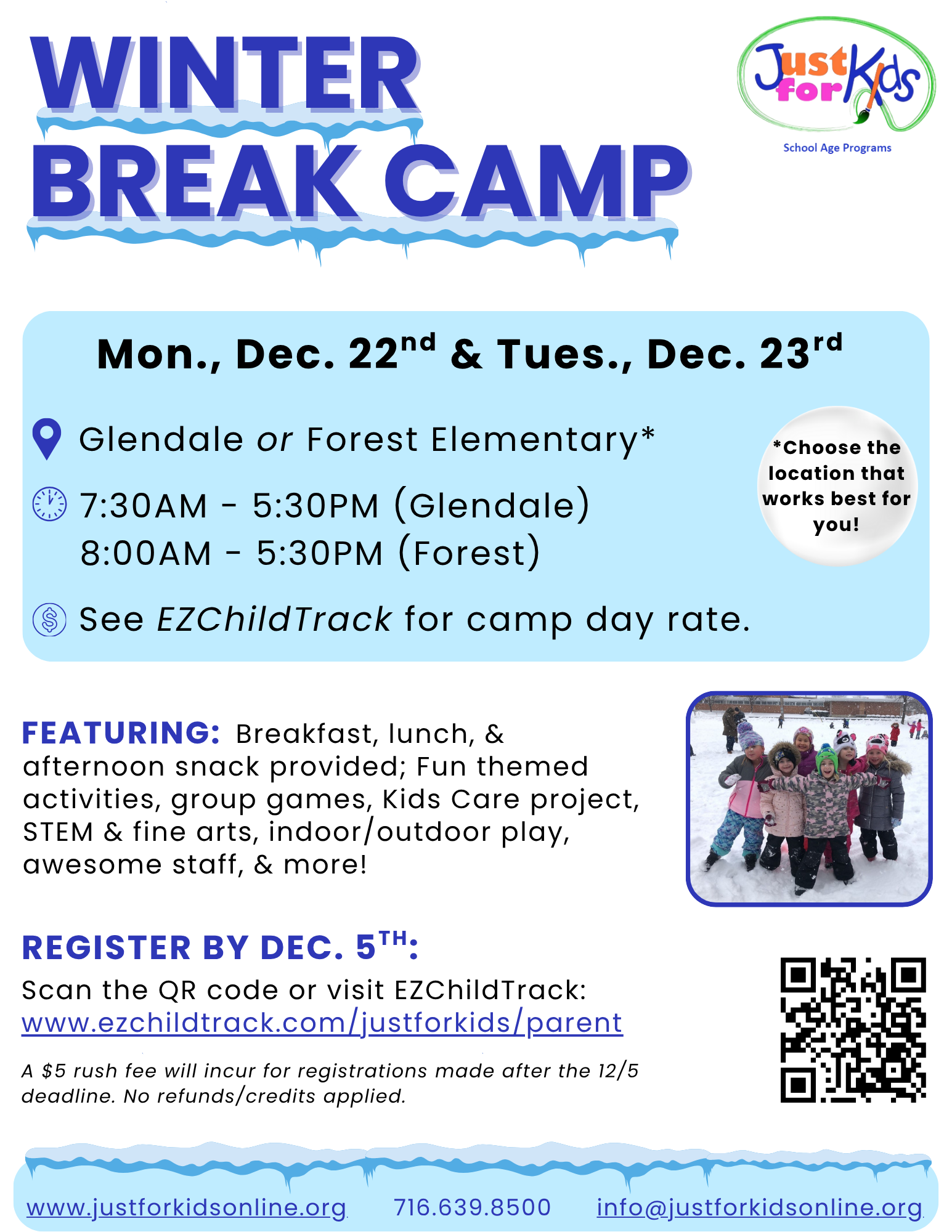 Just for Kids is excited to offer Winter Break Camp on Monday, December 22nd and Tuesday, December 23rd. Families can choose the location that works best for them: Glendale or Forest Elementary.